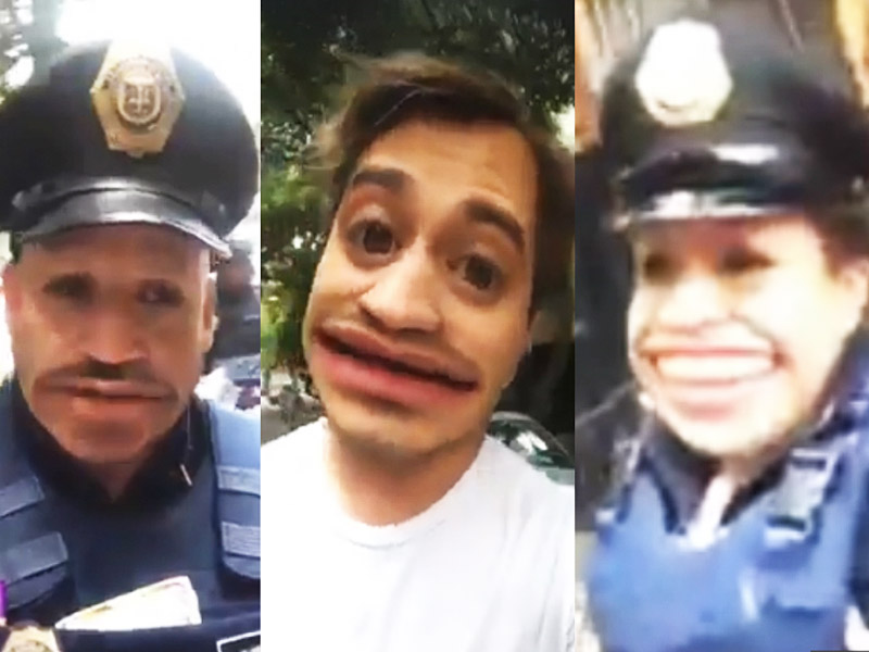El conductor captó a los uniformados con el filtro “Realidad Aumentada”, por lo que sus rostros fueron distorsionados; eso no detuvo a los policía para que continuaran con su labor.