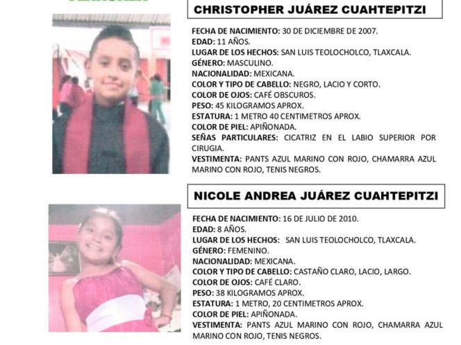Autoridades de Tlaxcala activaron la Alerta Amber para localizar a los hermanos Christopher y Nicole Andrea Juárez Cuahtepitzi, de 11 y 8 años, quienes desaparecieron en San Luis Teolocholco.